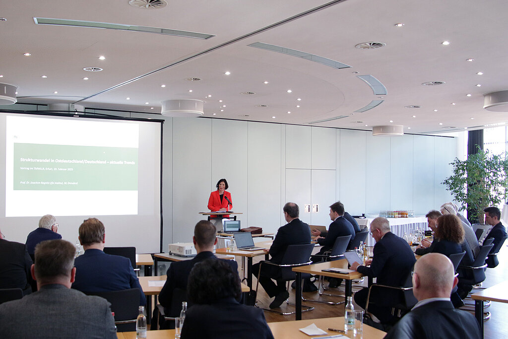 Die wirtschaftliche Entwicklung der letzten Jahre müsse alle wirtschaftlichen Akteure mit Sorge erfüllen, sagte die Ministerin. „Nach zwei Jahren mit rückläufigem Bruttoinlandsprodukt wird es auch 2025 in Deutschland und Thüringen absehbar kaum Wachstum geben.“ Innerhalb Deutschlands drohe Thüringen zudem den Anschluss an die wirtschaftsstarken Bundesländer zu verlieren. Dies habe weniger konjunkturelle, als vielmehr strukturelle Gründe – von der demografischen Entwicklung über die Investitionszurückhaltung in für Thüringen wichtigen Branchen, hohe Energiekosten und Steuern bis zu staatlicher Überregulierung praktisch aller Wirtschaftsbereiche.
